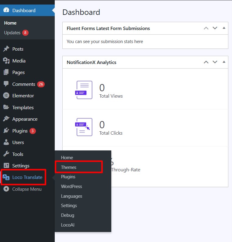 - After activation, navigate to the Loco Translate section and click Themes.