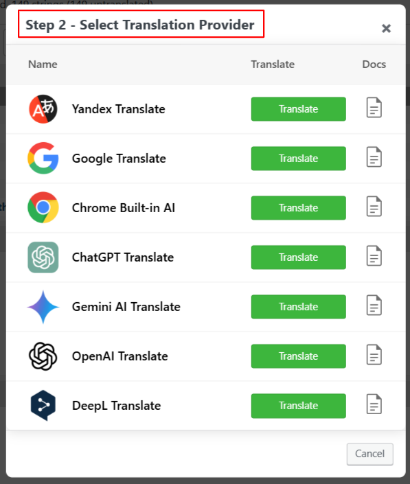 - Click on the Translate button, and a prompt will appear to choose the translation provider.