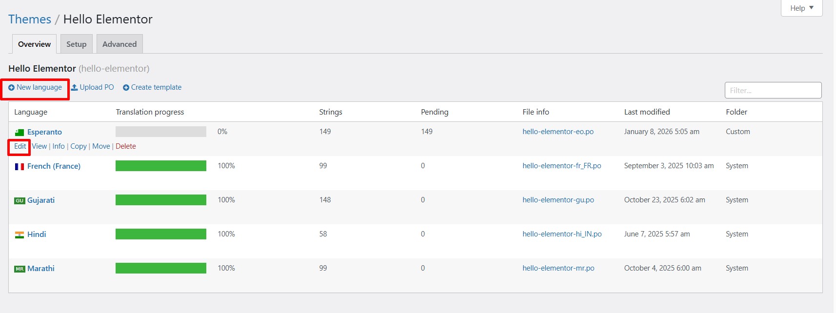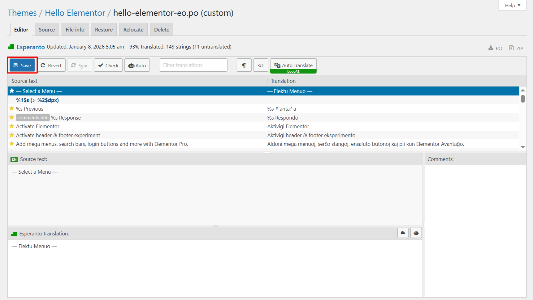 - Lastly, save the translations, which will update the .po and .mo files for your selected plugin or theme.